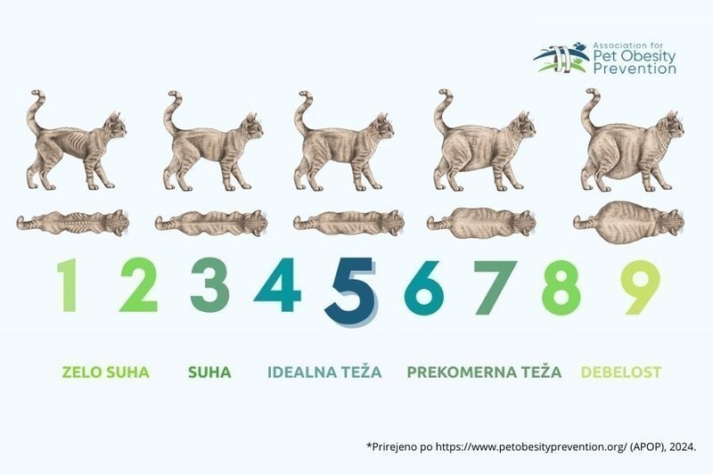 Veterinarji za oceno mačk uporabljajo 9-stopenjsko lestvico telesne kondicije ali BCS (Body Condition Score).